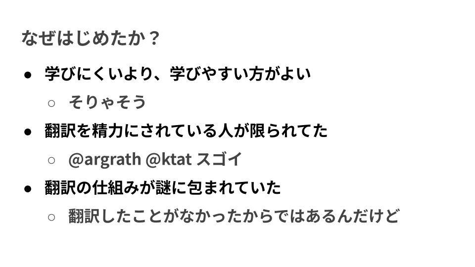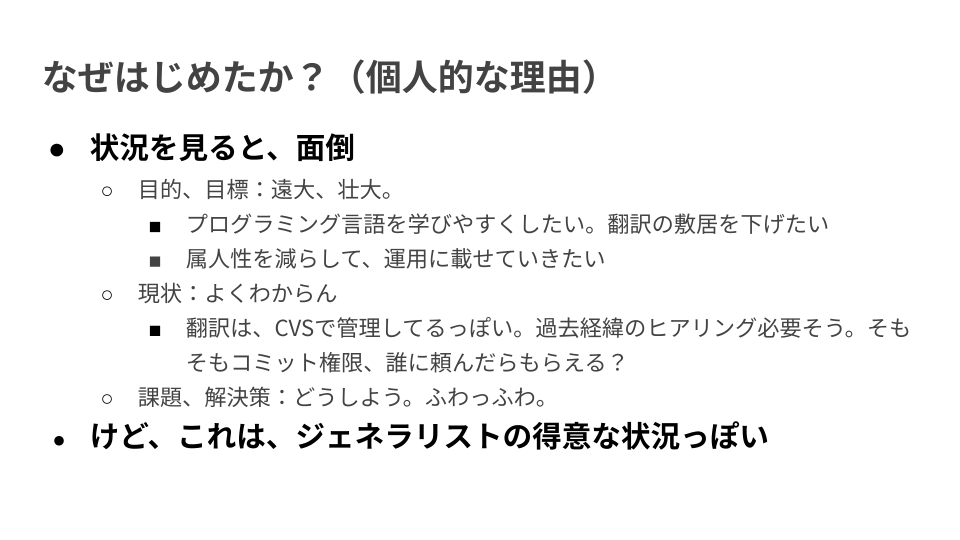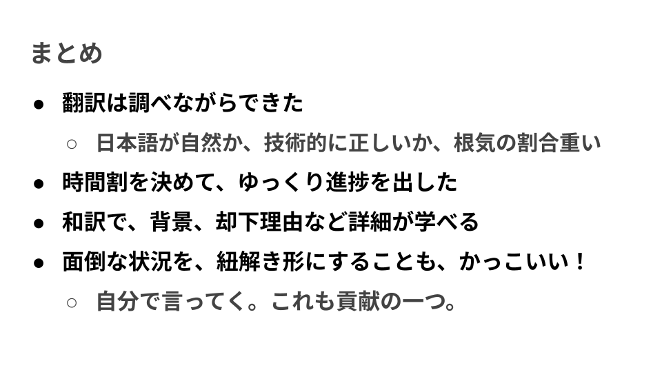 翻訳、意外と怖くない。億劫なことでも、進捗を出す工夫。ジェネラリストが技術コミュニティに貢献する。 こんなことが伝わったら嬉しいです。ではいきます。