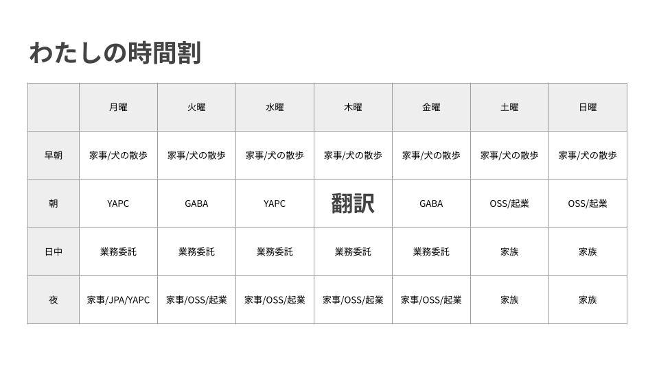 翻訳業は、木曜日の朝。8:00 - 10:00 を翻訳に当てています。これ以外に月に1回、Hack For Perlというイベントを開いて、終日作業しています。