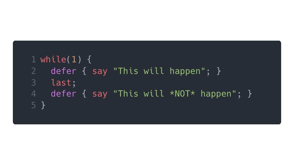 このdeferは、実行されたら活性化されるので、このコードの4行目のdefer blockは、3行目でループを抜けてしまっているので、呼ばれません。一方、当初の大文字で書いたLEAVEやFINALLYは、Perlの慣習的に、実行時に遭遇しなくても、コンパイルされていれば、実行されるブロックに見えるので、却下されてます。