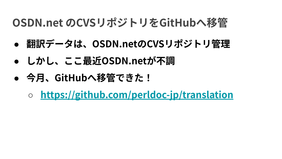 最後に1個だけやったことを紹介すると、翻訳データのメインストリームが、老舗のOSDN.netというリポジトリのホスティングサービスに、CVSリポジトリとして管理されていたのを、GitHubに移管しました。