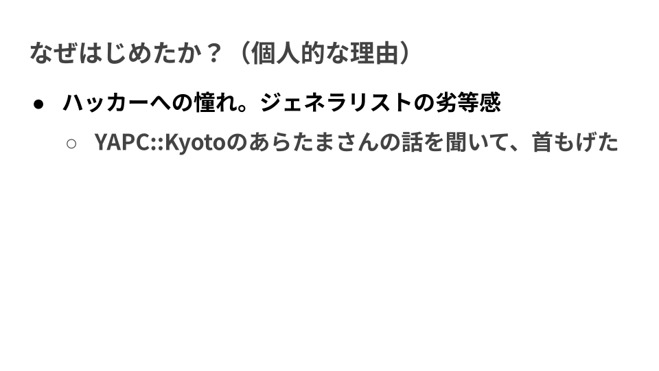 ちょっと個人的な理由にも触れると、コードを書くのは楽しいなーと思いますし、不器用なりにコードを書く以外にもマネジメントなど色々やってこれましたが、尖っていない劣等感があるんですよね。最近、