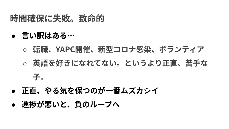 いや、言い訳は、いくらでもあるんですよね。ただ、これもやる気があれば、進捗出していたのかもしれない?